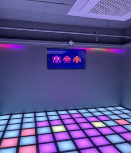 地下2階に降りると、ネオンカラーに彩られたゲーム空間が登場。カラフルなジャンプマットと大きなスコアボードが目を引き、照明はやや暗めでLEDが映える演出。マットは青・赤・黄色に分かれ、ダンスゲームのような雰囲気です。広すぎない空間ながら、音楽と一緒に思いきりジャンプできて、友達と盛り上がるにはぴったり!